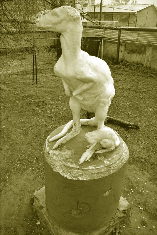 К сожалению, гипсовый памятник без нужного ухода выглядит не лучшим образом - у кенгуренка обита голова, а у кенгурихи - уши и частично хвост..