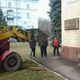 Рабочие пытаются снять с фасада мемориальную табличку, говорящую о том, что борьбу с фашистами в Днепродзержинске возглавлял коммунист Казимир Ляудис.