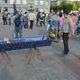 Все это сопровождалось тяжелой, накаляющей негатив музыкой - саундтреком к фильму "Реквием по мечте" Клинта Мэнселла, под текст, читаемый ведущим. Окружившие процесс зрители стояли, как завороженные. Некоторые женщины плакали. На лицах окружающих читался ужас. Бродячий пес обходил людей, застывших в своем «горе». Проходящие мимо дети были явно напуганы происходящим на площади. "Так нельзя! Это плохая примета - класть живого в гроб!" - обронила какая-то женщина.