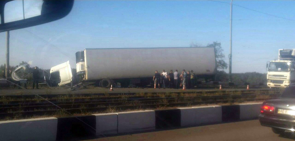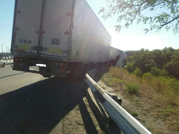 Сегодня примерно в 16:00 с Кайдакского моста практически слетела фура. Об этом журналист Информатора сообщает с места аварии.