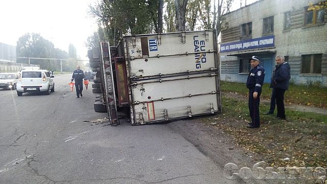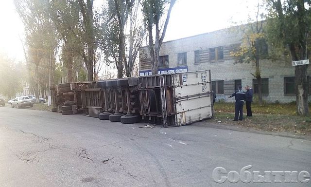 Крупногабаритное транспортное средство перевернулось при выполнении поворота. В кабине фуры находился только водитель, который получил некритичные телесные повреждения. У автомобиля разбито лобовое стекло.