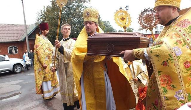 Перед началом богослужения в собор были занесена святыня - мощи святых мучеников Космы и Дамиана Римских, бессребреников и чудотворцев. Святые мощи прибыли к нам из Афонского подворья г. Киева и пробудут до вечера 16 октября.