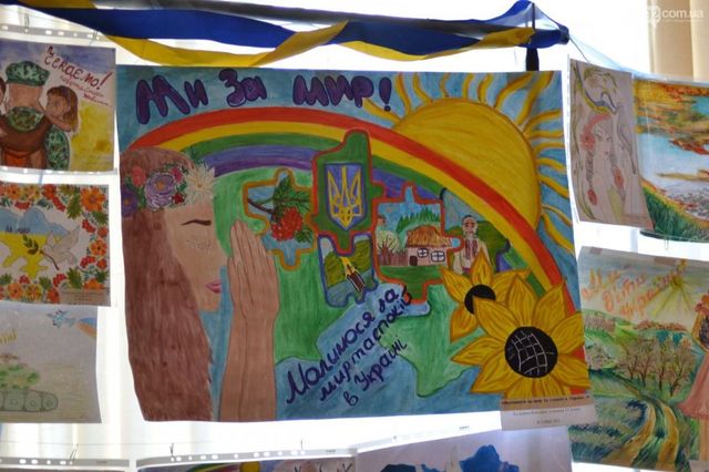 Для приглашенных бойцов подготовили тематическую выставку детского рисунка "Україна - моя Батьківщина". В своих работах школьники посредством художественных образов и символов пожелали Украине самого главного - единства, мира и спокойствия.