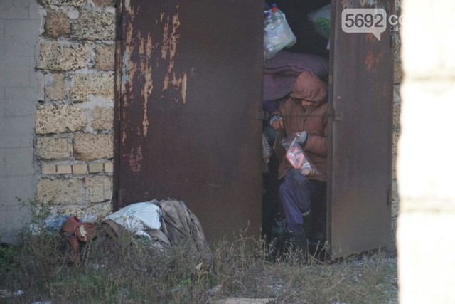 Вокруг гаража нет разбитых или пустых бутылок из-под алкоголя. Лишь за приоткрытой дверью сидит женщина и что-то ест из банки.