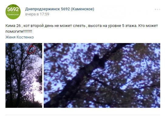 21 октября в 15:15 на телефонную линию Службы спасения «101» поступило сообщение с просьбой о помощи, которая необходима по улице Дмитрия Яворницкого (Кима). По указанному адресу кошка взобралась на тополь на высоту около 15 метров и около трех суток не могла спуститься на землю. Об этом сообщили в пресс-службе ГСЧС, пишет 5692.