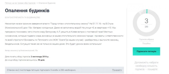 В документе жильцы дома №15 А по проспекту Василия Стуса (Комсомольскому) выразили свое возмущение тем, что батареи в их квартирах по состоянию на 1 ноября остаются холодными, несмотря на громкие заверения власти о готовности города к отопительному сезону. "(Батареи, - Авт.) Даже не заполнены водой! На улице +5, в квартирах +10", - пишут жители Каменского (Днепродзержинска). При этом авторы петиции отмечают, что прекрасно понимают, чего стоило мэру Белоусову А.Л. решить в Киеве вопрос с поставкой газа и предлагают призвать к ответственности по всей строгости местных чиновников, которые подвели мэра и оказались виновны в срыве отопительного сезона в городе. "Виноваты ли Теплосети или ЖЭК "Оселя"(в нашем случае) - разберитесь и выгоните наконец бездельников. Ситуация такая же не только в нашем доме. Это будет уроком всем остальным!", - говорится в петиции.