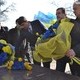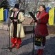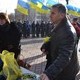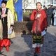 Участники митинга выстроились в несколько рядов напротив памятника Тарасу Шевченко и держали в руках удочки с сине-желтыми флагами.
