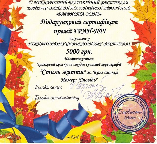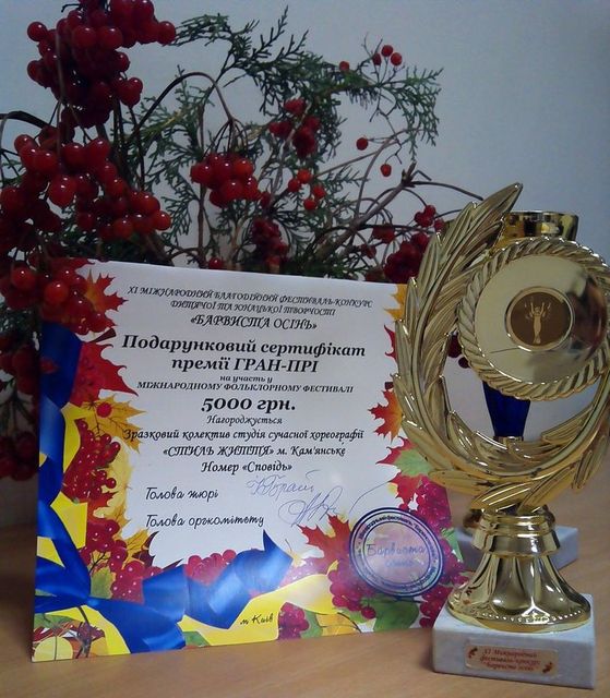 Детский творческий коллектив студии современной хореографии «Стиль жизни» Центра внешкольной работы и детского творчества принес Каменскому еще одну победу - Гран-при 11-го Международного благотворительного фестиваля-конкурса «Барвиста осінь», который проходил в городе Киев.