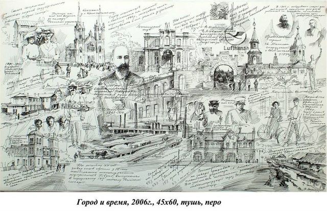 Один из основных сюжетов творчества Валентины Лаушкиной - городской пейзаж. Эта тема волновала ее всегда. Она родилась и выросла в Днепропетровске, а после переезда в Днепродзержинск посвятила немало произведений изображению храмов, площадей, проспектов в их едином временном пространстве. Но даже в изображении архитектурных строений читается ее индивидуальный стиль. Город, который она многократно писала в лирических тонах, открылся ей в новом свете, когда Валентина работала художником в Музее истории Днепродзержинска. Фотографии из музейних фондов, использовавшиеся для экспозиций, вызвали у нее желание объединить в одну композицию ключевые моменты городской истории.