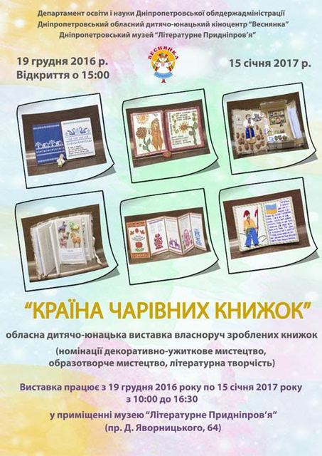 Яскраві книжки з цікавими історіями та оригінальним оформленням. Школярі Дніпропетровщини власноруч виготовляють книжки. У них вкладають любов, натхнення та майстерність. Більше 130 авторських книжок можна буде побачити на виставці «Країна чарівних книжок» у музеї «Літературне Придніпров’я».