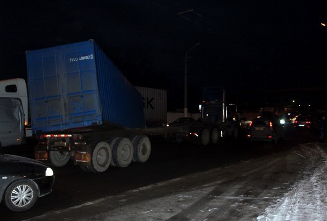 По словам полиции, в аварии никто не пострадал. Перевернувшийся прицеп никого не задел. Но вот из-за того, что контейнер лёг на полдороги, на ул. Янтарная образовалась пробка. Маршрутки и автомобили объезжают по тротуарам или через заправку.