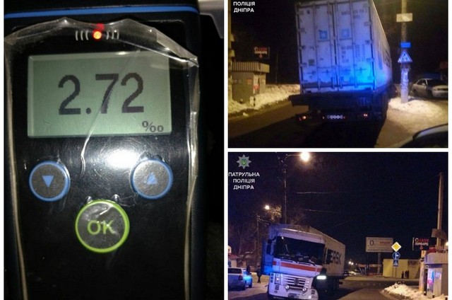 Сегодня ночью на улице Баженова патрульные Днепра остановили грузовой автомобиль, который нарушил правила дорожного движения. Во время беседы с водителем офицеры заметили у него признаки алкогольного опьянения.