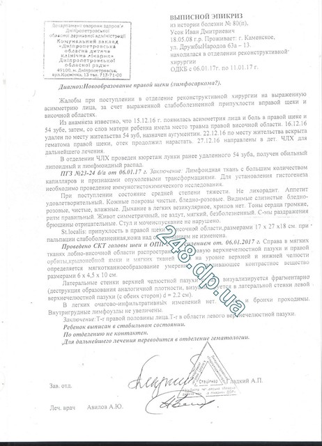 У мальчика вдруг распухла правая щека и висок. В местной стоматологии все списали на воспалительный процесс в зубах. Несколько зубов удалили, но Ване становилось только хуже. После долгих обследований, врачи ошарашили новостью - лимфома Беркетта. Этот вид рака лимфатической системы опасен тем, что быстро распространяется в кровь, спинномозговую жидкость и костный мозг. Сейчас мальчишку нужно срочно спасать здесь: http://248.dp.ua/projects/378