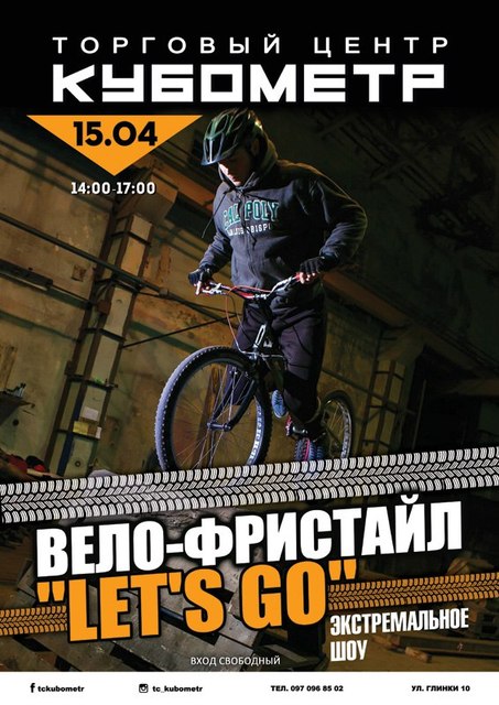 15 апреля с 14:00 до 17:00 ТЦ Кубометр приглашает вас на захватывающей и экслюзивный вело-фристайл «Let's Go». Это безопасное, хорошо спланированное выступление различных экстремальных дисциплин!