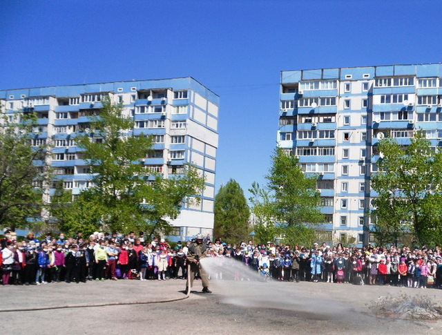 На шкільному подвір’ї дітей вже очікував пожежно-рятувальний автомобіль й команда рятувальників, які продемонстрували оперативне розгортання пожежного автомобіля для гасіння пожежі. Хлопці та дівчата спостерігали, як пожежники прокладають рукавну лінію та гасять умовну пожежу за допомогою води й піни.
