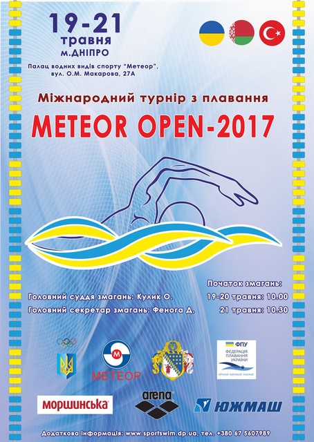 З 19 по 21 травня 2017 року в Палаці водних видів спорту «Метеор» відбудеться Міжнародний турнір з плавання « Meteor Open – 2017» серед дівчат та юнаків 2003, 2004, 2005, 2006 року народження та молодших.