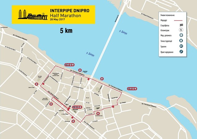 (5 км) Пл. Героїв Майдану (старт) – просп. Дмитра Яворницького – вул. Харківська – вул. Магдебурзького права – пл. Успенська – вул. Ливарна – вул. Січеславська Набережна – вул. Юліуша Словацького – просп. Дмитра Яворницького – пл. Героїв Майдану (фініш).