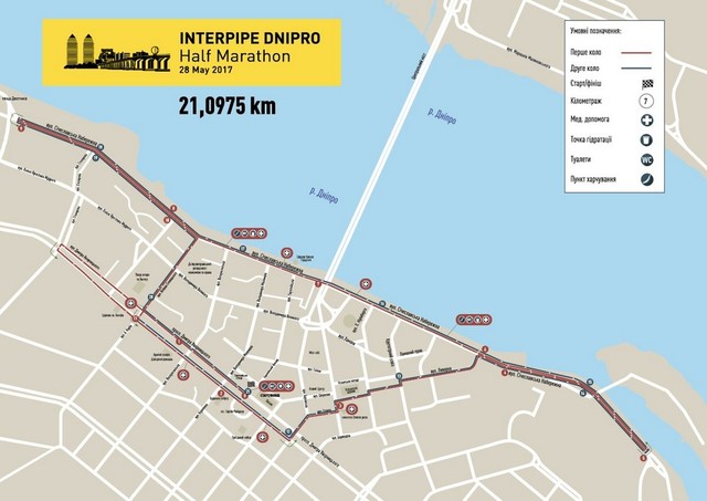 Перехрестні вулиці за маршрутом яким рухаються спортсмени також мають бути перекриті. (21,0975 км) Пл. Героїв Майдану (старт) – просп. Дмитра Яворницького – вул. Харківська – вул. Магдебурзького права – пл. Успенська –вул. Ливарна – вул. Січеславська Набережна – вул. Юліуша Словацького – просп. Дмитра Яворницького – пл. Героїв Майдану (фініш).