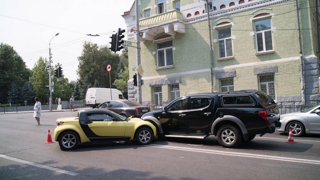 Когда девушка на Smart сворачивала на Андрея Фабра вниз, то не справилась с управлением и въехала в Mitsubishi.