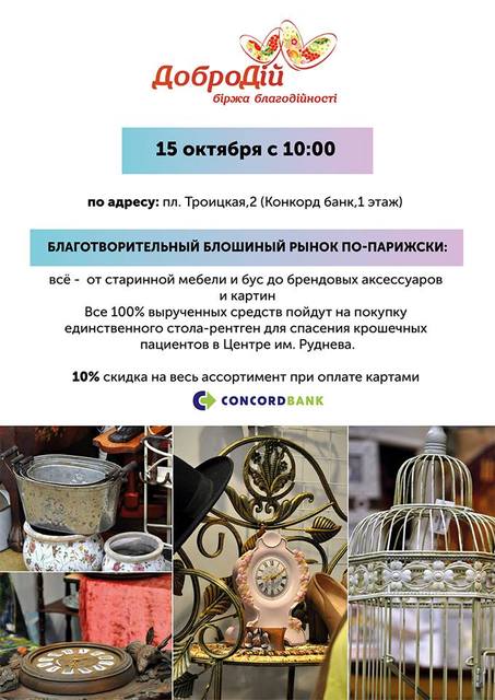 15 октября в Днепре состоится грандиозный благотворительный блошиный рынок в лучших парижских традициях. Все 100% выручки от продажи сокровищ барахолки пойдут на покупку стола-рентгена для спасительных операций маленьким пациентам в Центре им. Руднева.