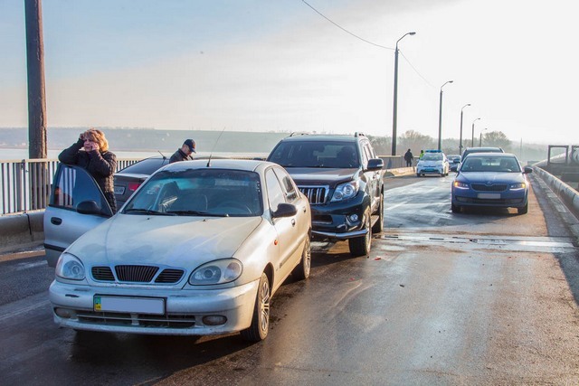 Все автомобили, которые попали в аварии, двигались со стороны Приднепровска в направлении улицы Маршала Малиновского. Сначала перевернулся набок автомобиль Daewoo Lanos в конце моста, что стало первым ДТП. Со слов водителя Toyota Camry Игоря, он ехал за Daewoo и въехал в отбойник, чтобы избежать столкновения. Водитель Toyota Corolla, не рассчитав дистанцию, тоже начал торможение в отбойник и врезался в Camry. У Camry повреждено заднее правое крыло, задняя правая фара, поцарапан бампер. У Corolla — передние левое крыло и левая фара, бампер, поцарапано правое переднее крыло.
