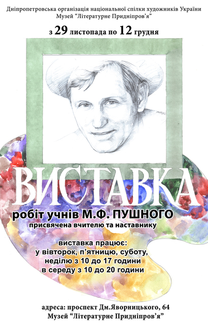 В музее Днепра «Литературное Приднепровье» сегодня, 29 ноября, в 15 часов откроют выставку памяти руководителя Народной студии изобразительного творчества Дворца студентов ДНУ Михаила Федоровича Пушного.