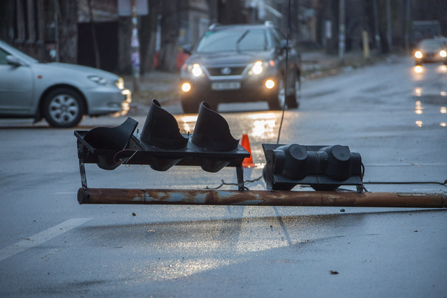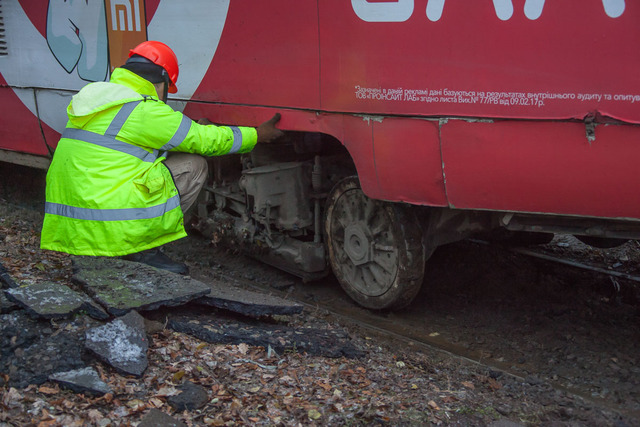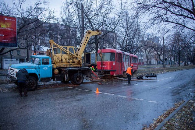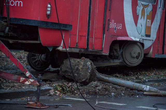 29 ноября на пересечении улиц Владимира Антоновича и Юрия Савченко трамвай сошел с рельсов и снес светофор. Кузов электротранспорта развернуло поперек трамвайных путей.