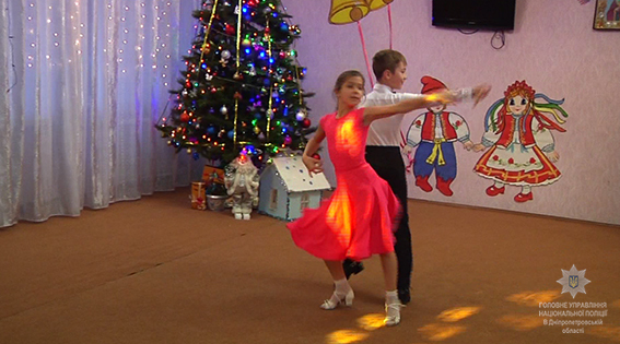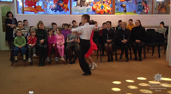 Чтобы развлечь воспитанников, полицейские пригласили с собой призеров танцевальных турниров Украины. По случаю праздника танцоры подготовили для детей латино-американскую программу. Зажигательные танцы в исполнении Анны Гребневой и Давида Степаненко, родители которого, кстати, работают в полиции, покорили маленьких зрителей. Напоследок дети получили в подарок полезные для формирования логического мышления пазлы.