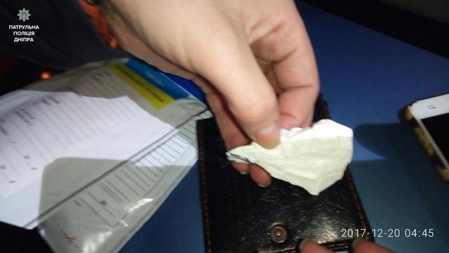 Патрульні застосували кайданки. А потім у присутності 2 свідків провели поверхневу перевірку громадянина. Як виявилося, йому було що приховувати. Поліцейські виявили у нього згорток з речовинами, схожими на наркотичні.