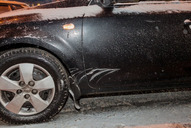 Водитель маршрутного такси протаранил автомобиль Kia правым передним колесом. Из-за этого на боковой двери Kia появилась крупная вмятина и несколько царапин. У автомобиля также повреждено боковое зеркало.