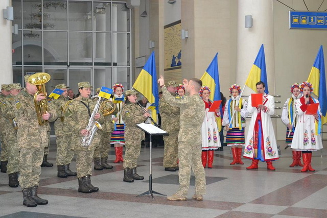 «Эта акция сегодня проводится повсеместно в Украине в местах массового пребывания людей: на вокзалах, в аэропортах, крупных торговых центрах, для того, чтобы почтить память героев Крут и порадовать людей украинским искусством», - рассказал дирижер оркестра капитан Александр Жарий.Военные музыканты и участники ансамбля совместно выполнили два номера - оркестрово-хоровую композицию «Круты», написанную военным дирижером из Киева Михаилом Рябоконем, и «Сто бойцов».