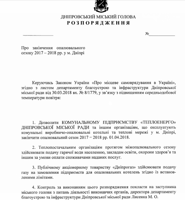 Согласно распоряжения, отопление планируют отключить 1 апреля. Данный документ разрешает КП «Теплоэнерго» и другим организациям, которые эксплуатируют производственно-отопительные котельные и тепловые сети в Днепре, завершить отопительный сезон в это воскресенье, сообщает 056.ua.