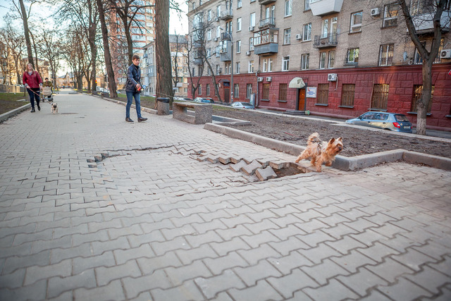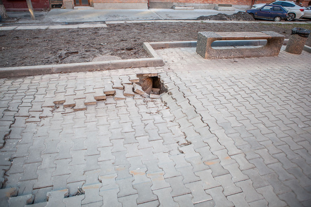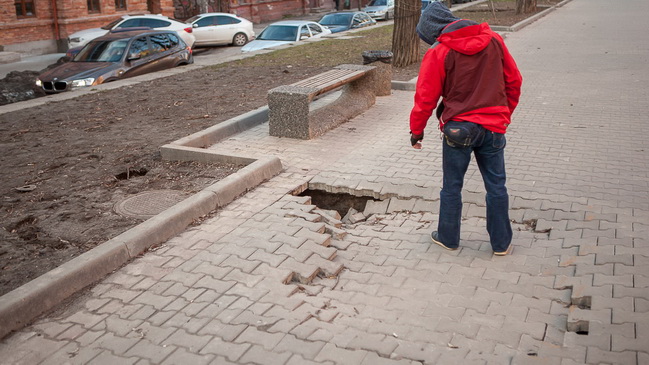 1 марта на проезжей части образовалась огромная яма, мешающая проезду автомобилей. Как только яму засыпали, рядом с ней образовалась новая. Остаток месяца улица держалась, как могла, но 4 апреля начала проседать плитка на пешеходной части.