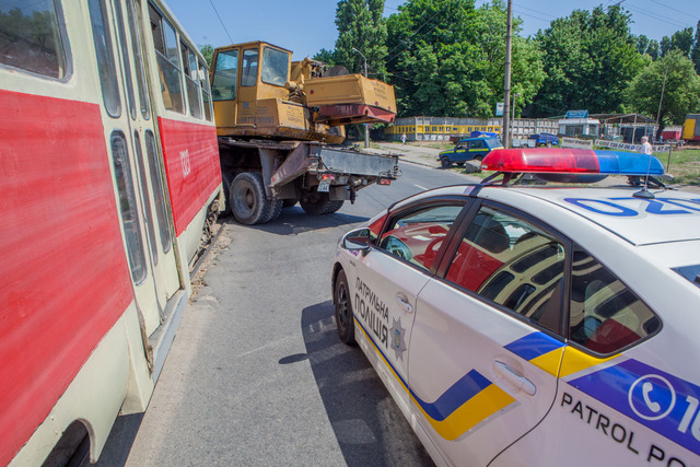 По словам сотрудников патрульной полиции, водитель крана при повороте не убедился в безопасности маневра и въехал в трамвай. В результате происшествия, парализовано движение трамваев в обе стороны. Детали аварии выясняются.
