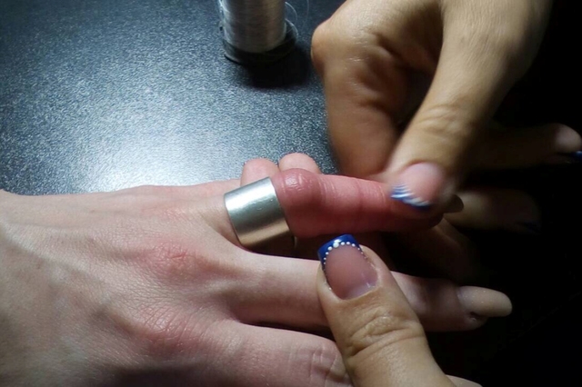 Так, використовуючи спеціальні ножиці для розрізання металу, рятувальники розрізали обручку та зняли її з пальця руки жінки.