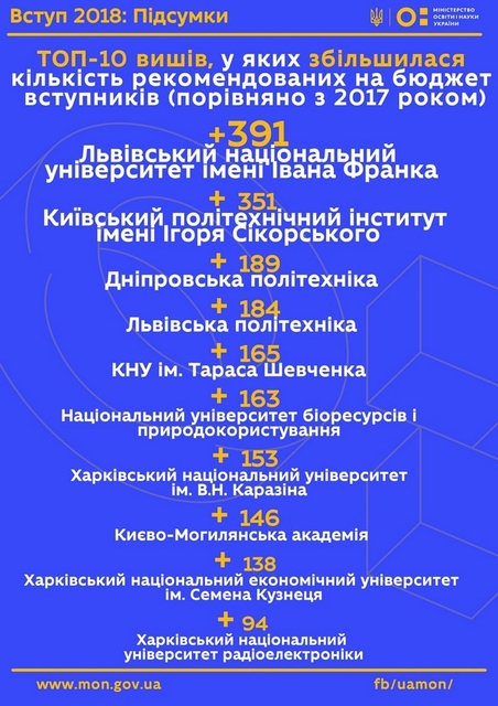 Министр образования и науки Лилия Гриневич огласила список высших учебных заведений, в которых увеличилось количество бюджетных мест.