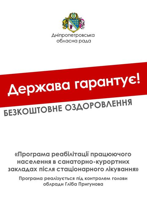 «Благодаря новой программе на Днепропетровщине, по сравнению с прошлыми годами, почти вполовину больше людей смогли пройти оздоровление в санаториях, и это только за полгода. Очень приятно быть соорганизатором этой программы в области. Мы вместе с Фондом соцстрахования работаем, чтобы каждый житель области знал о возможности получения бесплатной реабилитации. Этот процесс мы пристально контролируем».Лечение, проживание и питание в санаториях полностью оплачивается из государственного бюджета. На это Днепропетровской областью выделено почти полмиллиарда гривен, из расчета по 600 грн в день на человека.