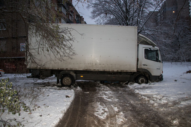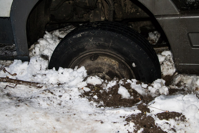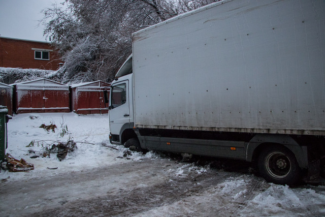 Водитель грузовика, выгрузив товар в магазин, уже собирался выезжать со двора, как угодил передними колесами в яму, которую не заметил под снегом. Автомобиль загруз в дыре настолько, что самостоятельно мужчина выехать не смог. В данный момент он приподнял автомобиль домкратом и ждет, пока приедет начальник. После этого они решат — вытягивать грузовик с помощью троса либо вызывать манипулятор.