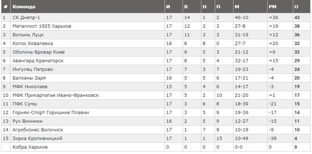 Звание "зимнего чемпиона" завоевал "Днепр-1", который за все полугодие только трижды не был на первом месте таблицы. Следом за ним расположился еще один дебютант Первой лиги: "Металлист 1925".