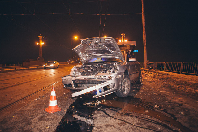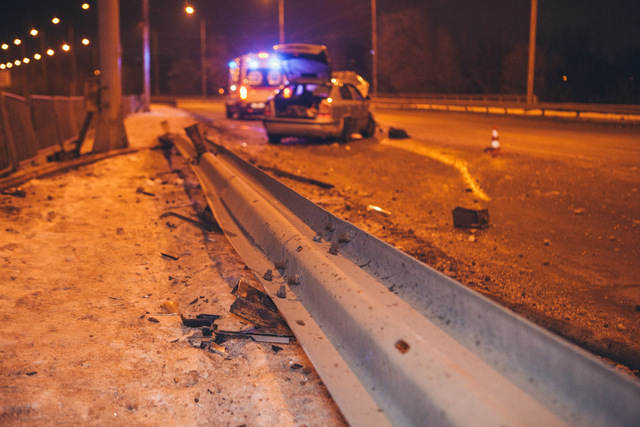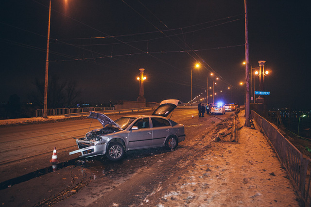 31 декабря на съезде с Амурского моста произошла авария: автомобиль Skoda, ехавший в сторону левого берега, вылетел на встречную полосу и врезался в отбойник.