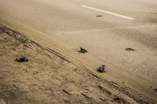 Может стая ворон побила. Вряд ли это была стая самоубийц и они сами в крутом пике в асфальт бились.
