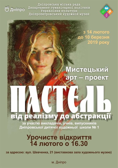 «Пастель - от реализма до абстракции» - под таким названием в выставочном зале Днепропетровского художественного музея с 14 февраля по 10 марта 2019 состоится арт-проект Днепровской детской художественной школы № 1.