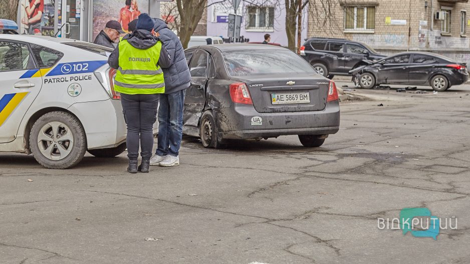 Сегодня, 21 февраля, в Днепре на перекрестке улиц Ярослава Мудрого и Половицкой столкнулись автомобили Hyundai и Chevrolet.