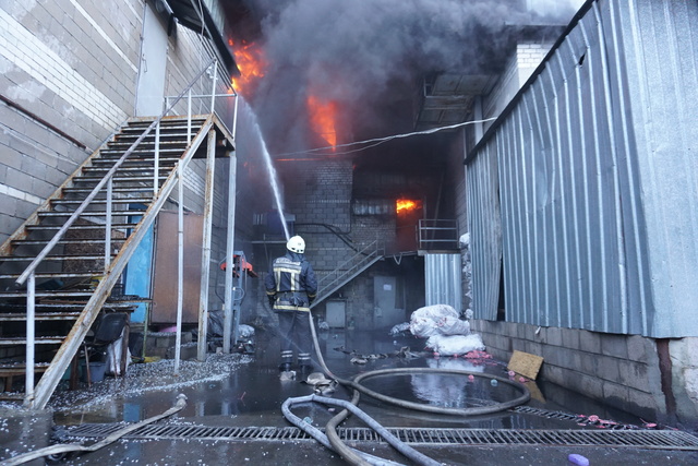 Горят производственные бытовые помещения ангарного типа предприятия по изготовлению пластиковых изделий.Сложность тушения заключалась в большой горючей нагрузке в ангарах, а именно пластиковое сырье, оборудование и готовая пластиковая продукция.
