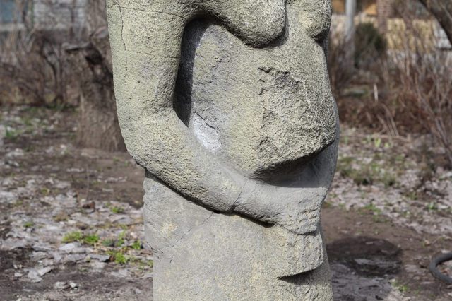 Вместе с сотрудниками Днепровского исторического музея журналисты Відкритого выехали на место, чтобы проверить, является ли каменная баба (в переводе с половецкого — праотец) настоящей.Как оказалось, каменный истукан весь в трещинах, замазан цементом, а внутри полый.