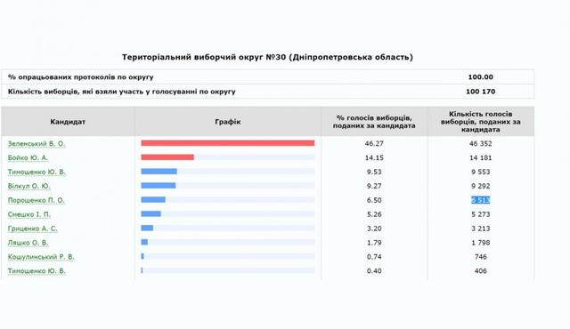 Результаты голосования на 30-ом округе: Владимир Зеленский - 46.27% (46 352 голоса), Юрий Бойко - 14.15% (14 181 голос), Юлия Тимошенко - 9.53% (9 553), Александр Вилкул - 9.27% (9 292), Петр Порошенко - 6.50% (6 513). На территориальном избирательном округе №30 всего проголосовали 100 170 избирателей.