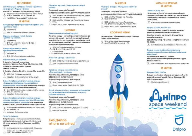 Но совсем без празднования Дня космонавтики Днепр не останется. Как сообщили нам в КП «Агентство развития Днепра», 12-14 апреля в Днепре пройдет Dnipro Space Weekend (Космические выходные в Днепре).