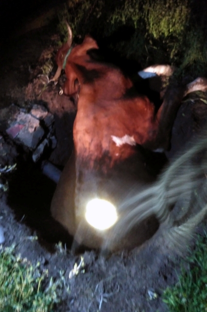 После чего, обвязав корову пожарными рукавами, сотрудники ГСЧС достали рогатый скот на поверхность.
