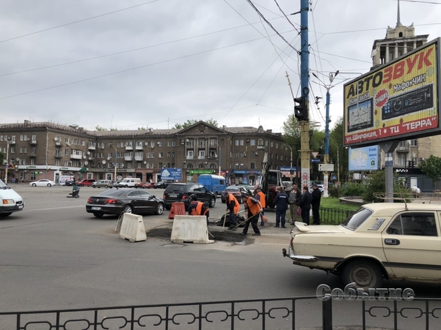 На Майдане Героев в Каменском латают дыру в асфальте, которая образовалась на месте порывов водопроводных сетей.