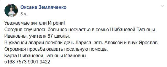 В социальных сетях организовали сбор средств. Деньги собирают для родственников, которым предстоит пройти нелегкое испытание. «Случилось большое несчастье в семье Шибановой Татьяны, учителя 87 школы. В ужасной аварии погибла дочь, зять и внук», — пишет Оксана Земляченко. Помочь можно отправив деньги на карту: 5168 7573 9001 9422 — Шибанова Татьяна Ивановна, мать погибшей в ДТП.